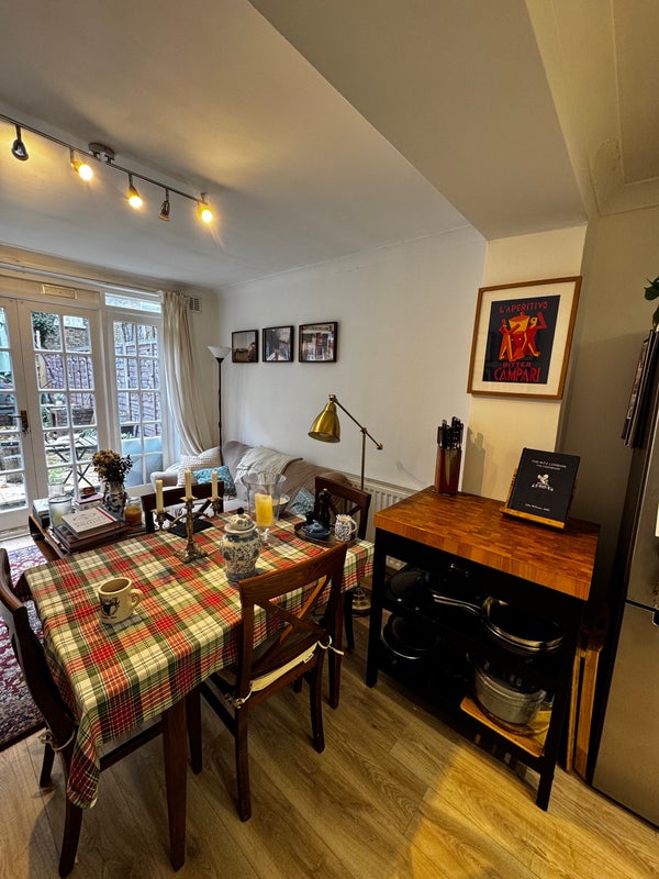 The flat’s fully furnished (most of it’s mine) and really feels like a home. There’s a big private garden that’s great for dinners and drinks in summer, plus a third room that’s set up as an office if you work from home sometimes (I do most days)