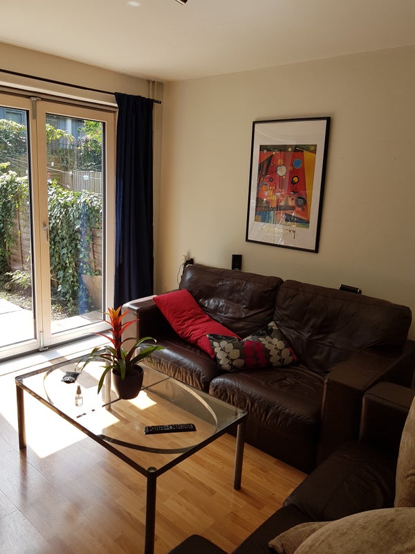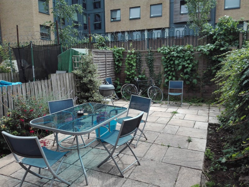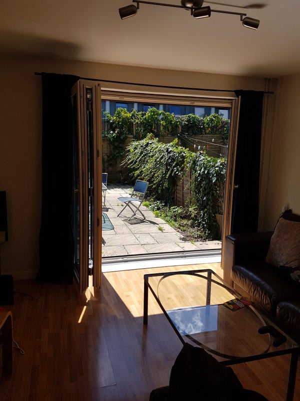 There is a living room and a South facing (sunny!) garden, kitchen with washing machine and dishwasher, 2 bathrooms and 4 bedrooms on 3 floors.