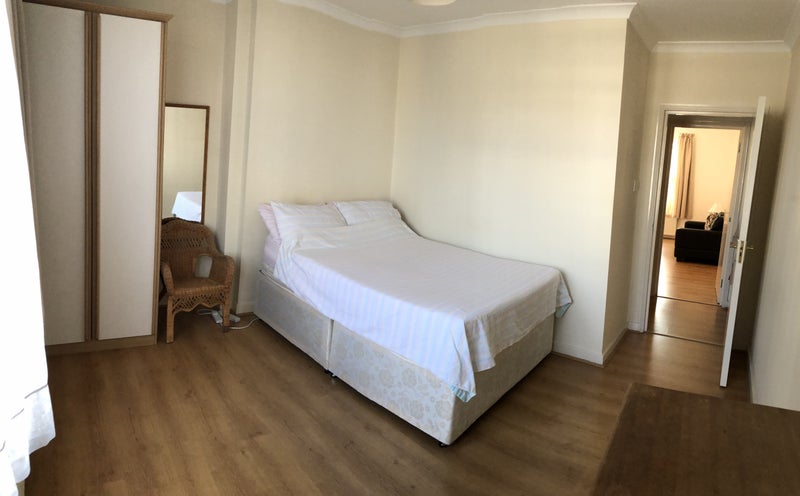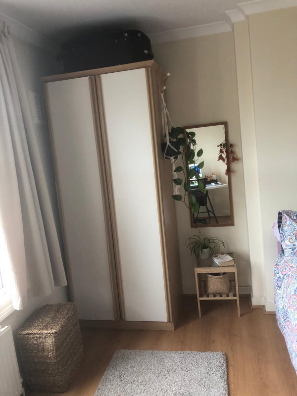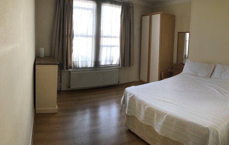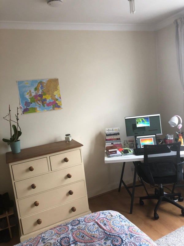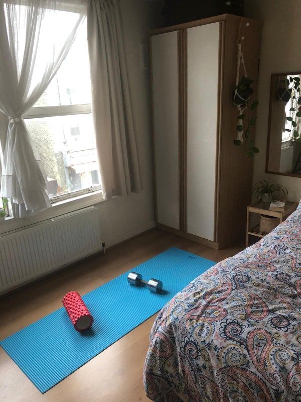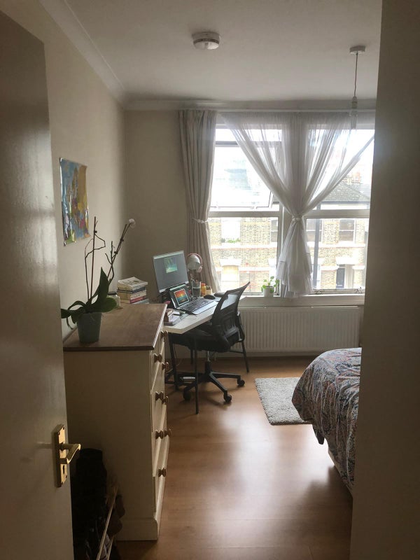 The room is a really good-sized east-facing double room. The photos show the room both lived in and empty and there is plenty of space for a desk and a yoga mat. The room is definitely bigger than it looks in the photos.