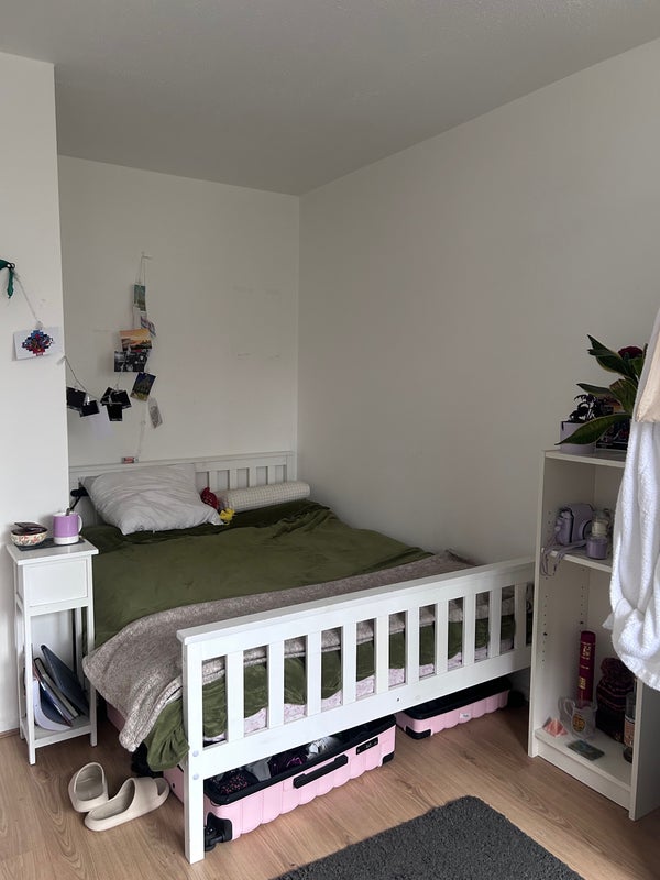 The room comes fully furnished, including a double bed, spacious wardrobe, chest of drawers. The house has one main bathroom and one small bathroom, shared between four people. The living room is spacious and open to the kitchen. We have a backyard area perfect for for the summer season!