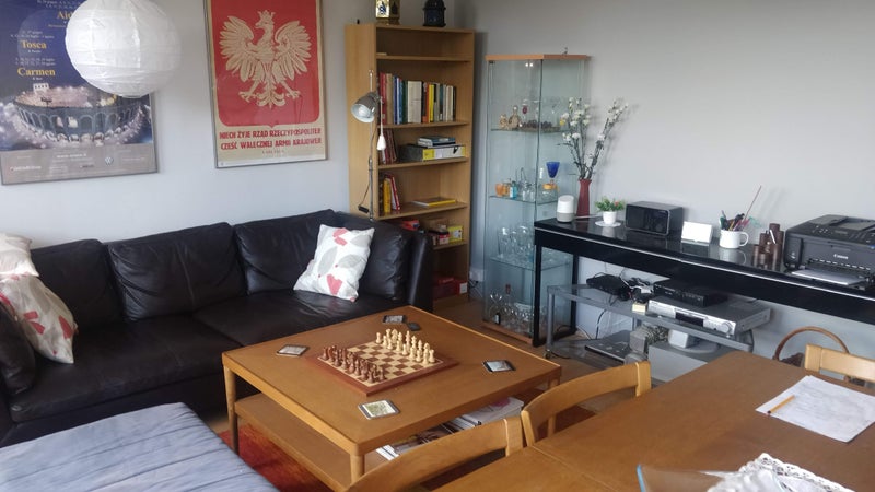 The flat is large, nice and warm, and with a large shared living room. It has been redecorated throughout and is fully furnished. There is very good security. On the first floor there is the living room where you can socialise. A large kitchen fully fitted with a washing machine, microwave, table and new fridge/freezer. Upstairs there are three bedrooms. The bathroom (with power shower) and separate toilet are on the mezzanine level. The flat is on the 4/5th floor of a low rise block.