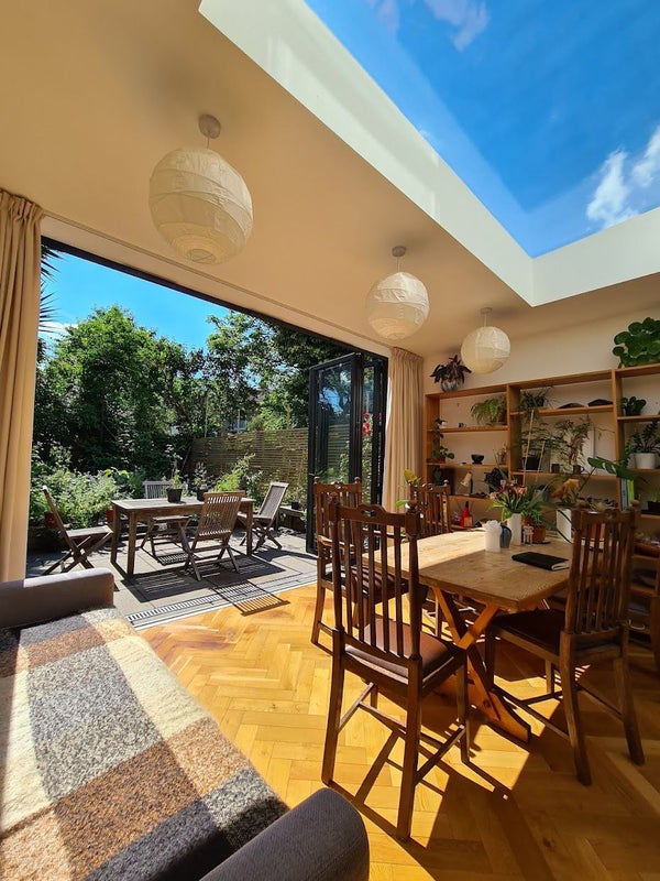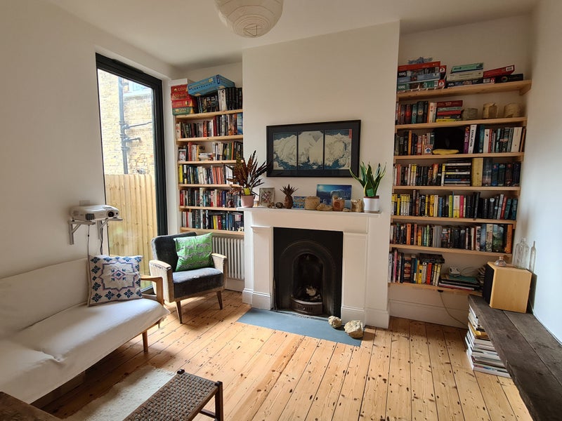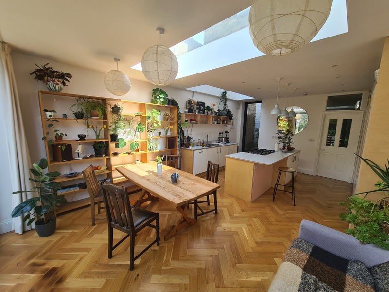 The house has five bedrooms, three bathrooms, a shared living/cinema room and a huge open plan kitchen/dining/living room with 2.6m high bifold doors that fully open onto a patio and garden. The kitchen has a six burner Smeg range stove, full height fridge and full height freezer. There are two massive skylights so you get light throughout the day. The kitchen itself is bespoke made of birch plywood with oak parquet floor and underfloor heating. The separate living room has a working fireplace and connects to the kitchen via a small courtyard. We have a 1080p projector/amp and speakers setup for a wall sized cinematic/gaming experience. We have 500Mb Up/Down fibre internet, with a mesh WiFi network throughout the house + ethernet ports. Dishwasher, large energy efficient washing machine and separate tumble dryer. Additionally we have a basement with space for storage. We attempted a wildflower meadow in the garden last year, which looks likely to be more of a meadow lawn for this year.