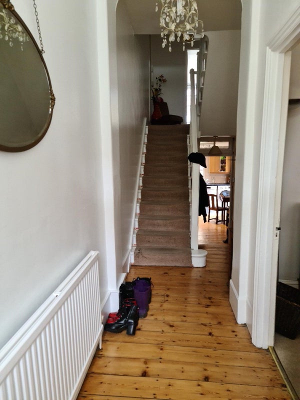 Shared bathroom, second loo, large kitchen (with dining table) and a lovely Norwegian Tree cat! All mod cons – dishwasher/washing machine/tumble drier/microwave and broadband. The kitchen has lots of space, with a table next to the window, overlooking the garden. Lots of stripped pine.