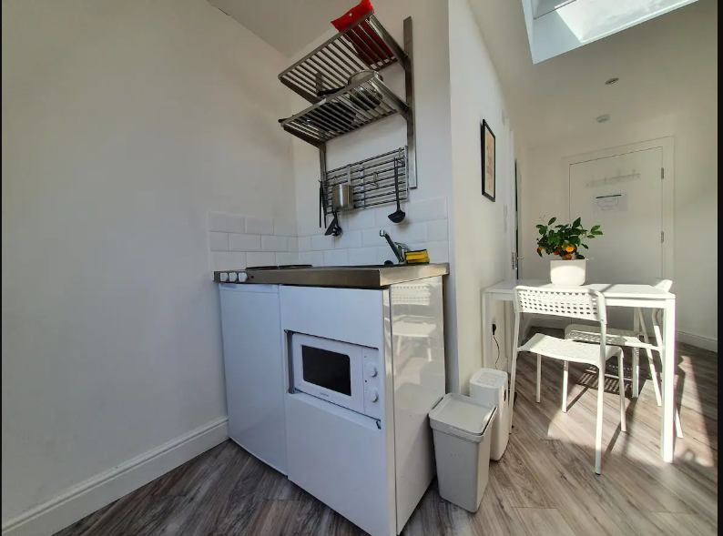 The studio includes a full double bed bed and a sofa bed/futon for two, kitchenette, private bathroom. There is also a washing machine available in the building The studio has plenty of light because of its velux skylights.