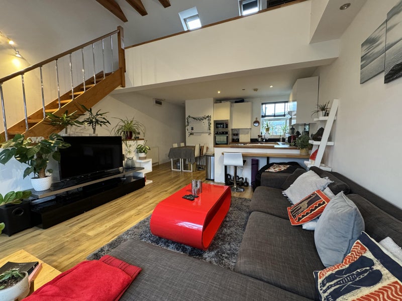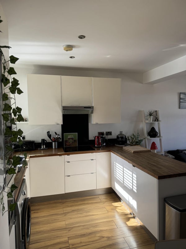 The flat’s bright and spacious with an open-plan kitchen/living room, plus all the usual bits, washing machine, fridge/freezer, dishwasher, and bath/shower.