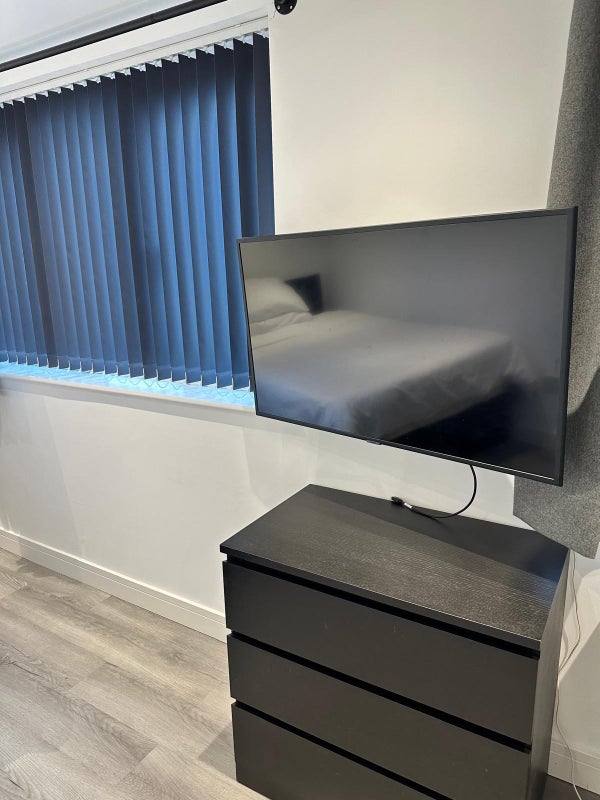 The room also has a 43" Samsung Smart TV. The TV is on an extendable 180 degree swivel mount so can be watched from almost anywhere in the room. There is also a HDMI connection from the desk to the TV for watching things from your PC/laptop.