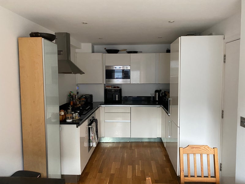 A fully integrated kitchen with gas hob, oven, dishwasher, washing machine, fridge and freezer. We also have an air fryer, microwave, toaster, kettle etc. You will have your own separate pantry cupboard and there are additional mutual storage cupboards. We share all crockery/cutlery/pots/pans, and split the cost of oil, salt/pepper, cleaning supplies etc.