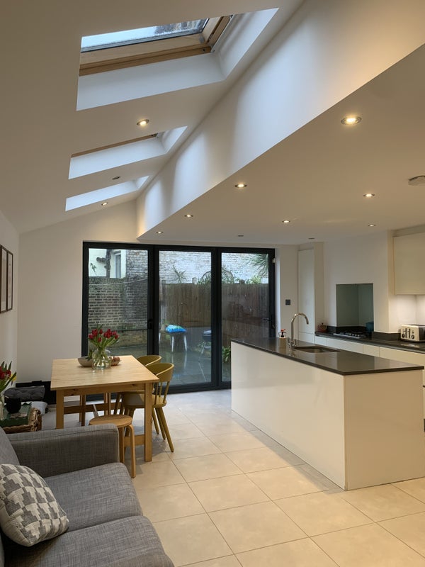 - Large open plan kitchen with dining table and sofa, and modern appliances (dishwasher, huge fridge freezer, coffee machine)