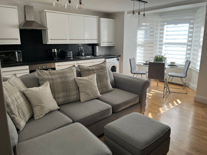 The flat has two bedrooms: one with a king-size bed and the other is a small room with a small double bed making it perfect for up to 3 guests maybe even 4. There’s also an open-plan fully equipped kitchen and living space.