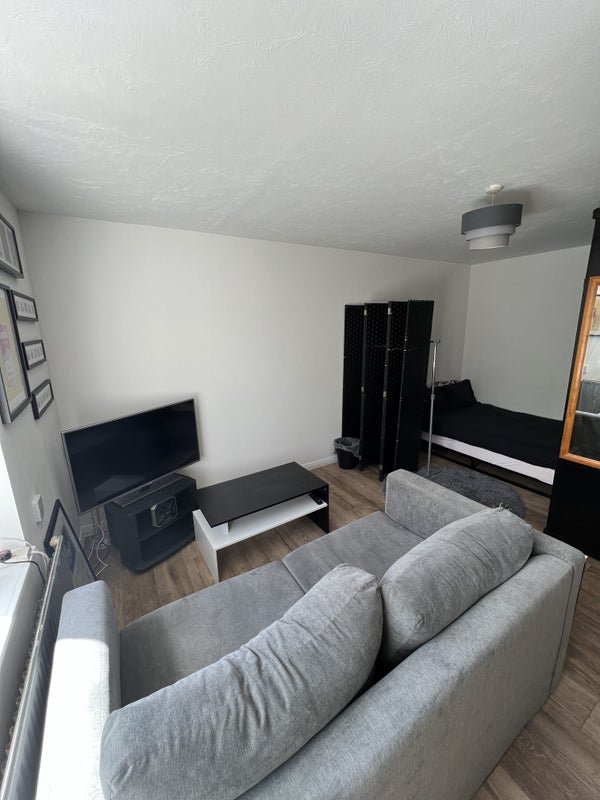 This is a double room with open plan kitchen plus living room, almost like a studio but only bathroom is shared with other 2 rooms in the flat. Free parking on premises all bills included. Short let only no deposit no couple no smokers.