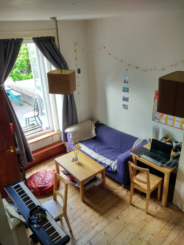 Bright studio flat with wooden floors, double bed, living room, bathroom (with bathtub) and separate kitchen with breakfast bar. Large terrace with picnic bench and ideal for summer BBQs. Comes fully furnished.