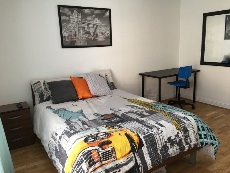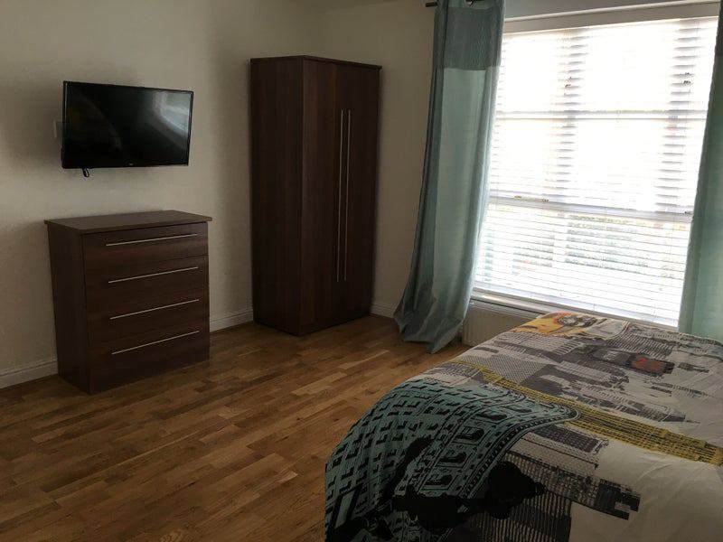 The room is very spacious and includes 2 wardrobes, a double bed with bedsides, TV with TV Licence, wall radiator, chest of drawers, a desk and a chair. There is plenty of storage in the room and in the house that can be used to store your belongings.