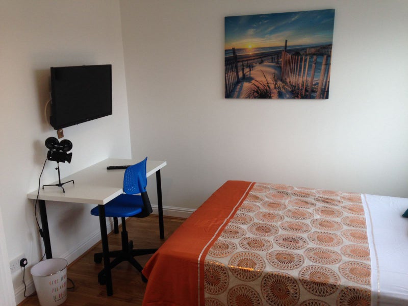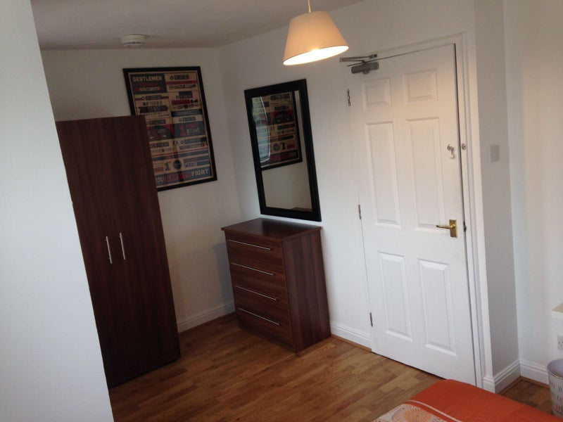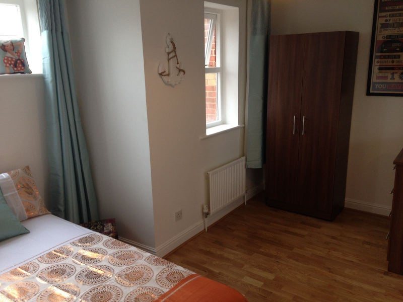 Wood laminate floor, double glazed window to front, wall heater and neutral decor. Double bed, wardrobe, chest of drawer, desk and chair.