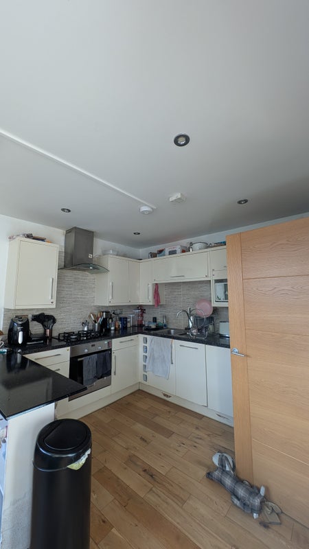 this is a four bedroom split level flat, on the ground floor so access from the street. there's an open plan kitchen and living room. kitchen fittings are all modern; there is a sofa, dining table,