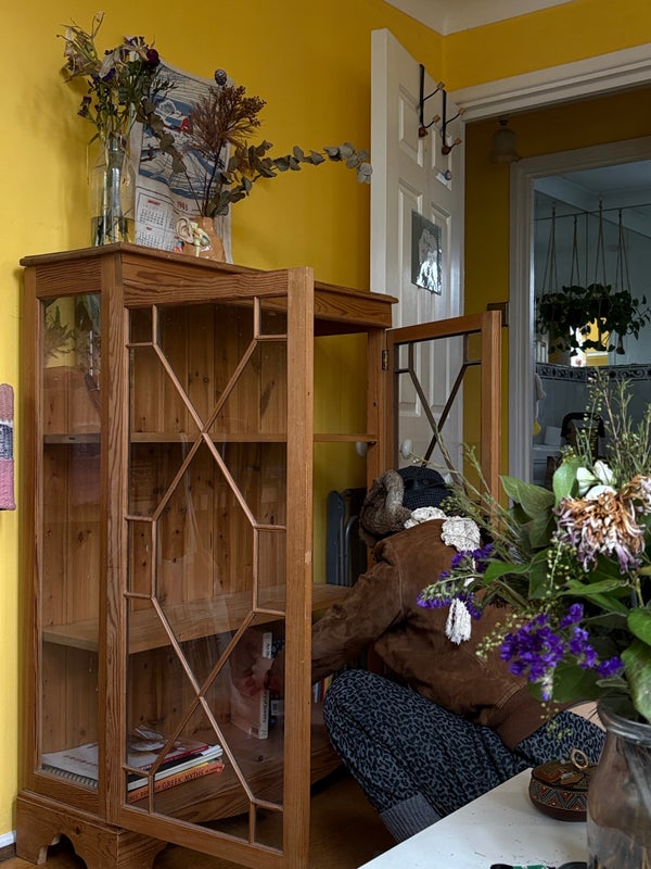 Warm and cozy flat with yellow tones and a blue-green kitchen.