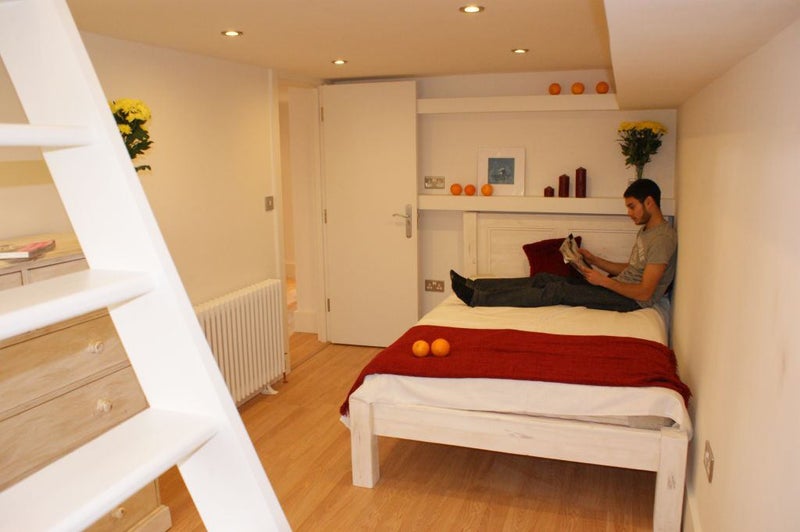 The bedrooms are a good size with double bed, wardrobe, desk, chair, bedside chest and jumper chest. The top rooms have walk-up wardrobe / loft storage areas