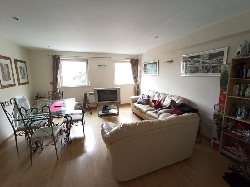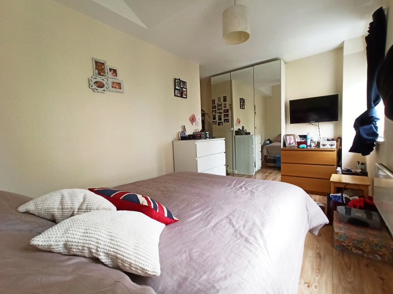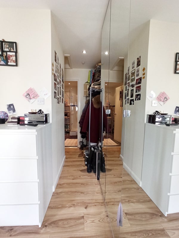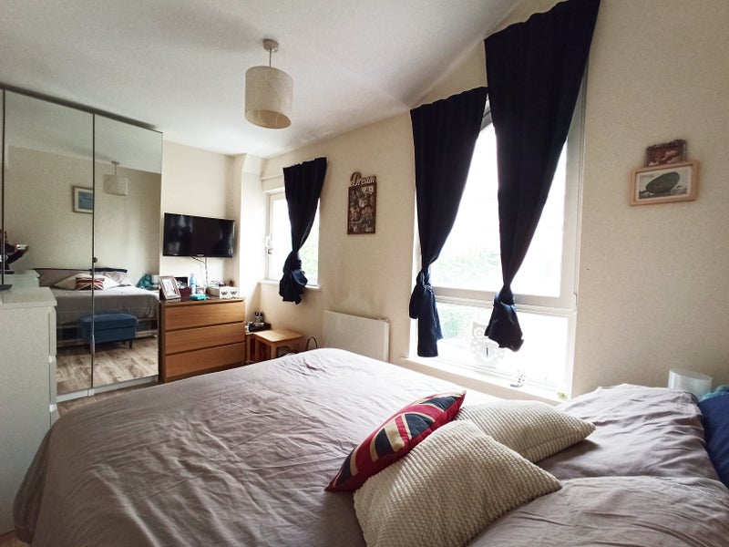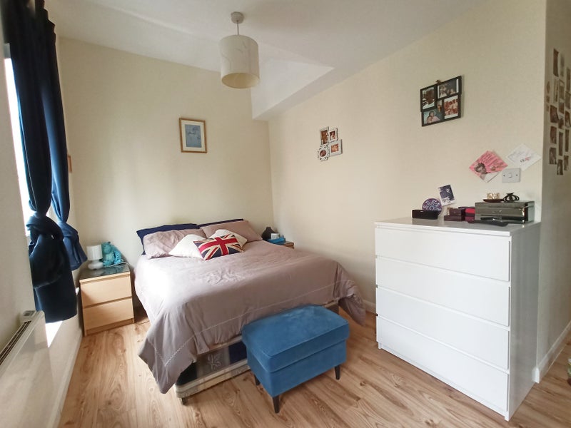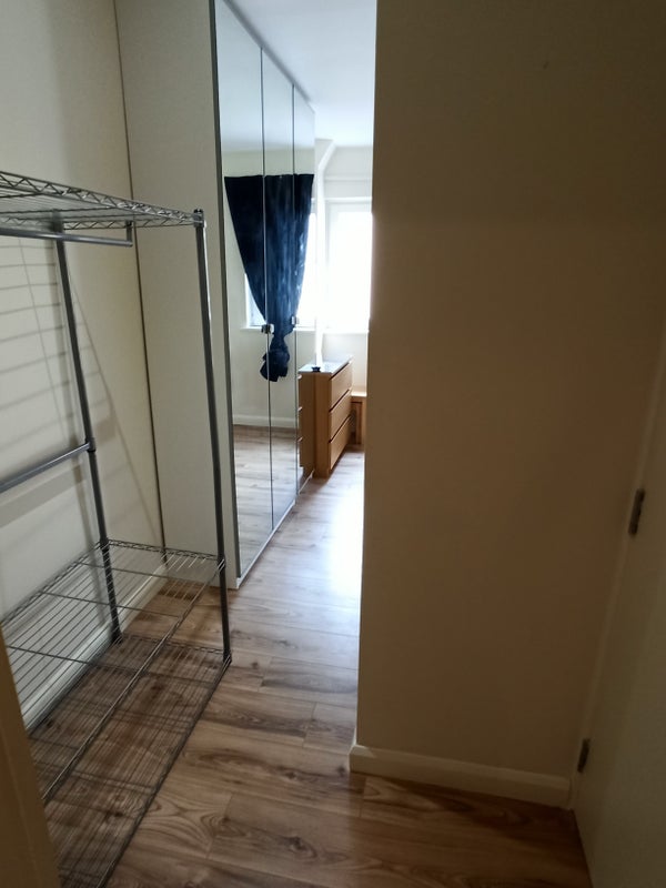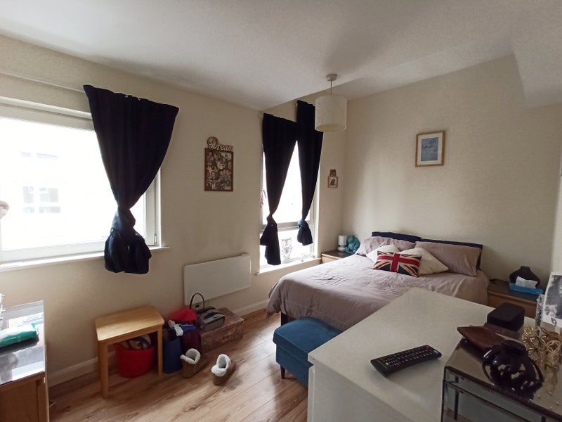 The bedroom is L-shaped with a big private shower room, wc and sink, 2 large windows for lots of light, mirrored cupboards, 32" TV. Please see the video. It comes fully furnished.