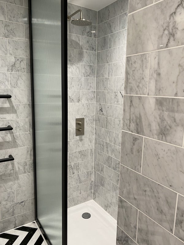 The separate luxurious bathroom has marble wall tiles and a beautiful walk-in shower. It also comes with heated towel rings.