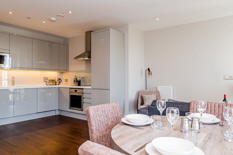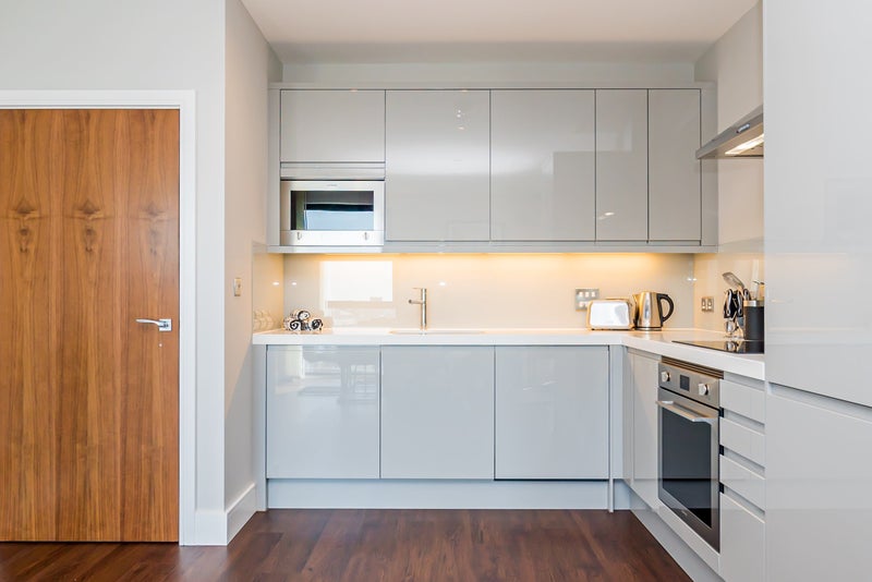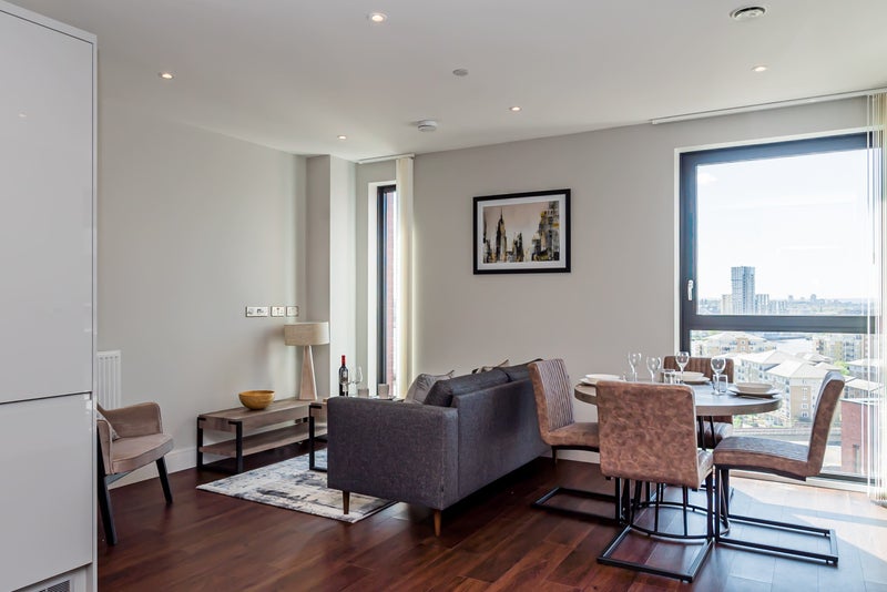 High quality specifications throughout, including walnut finish flooring, Smeg integrated kitchen appliances and large format white marbled floor and wall tiling to bath and shower rooms. Direct access from the living room to your private balcony with views overlooking River Thames and The O2.