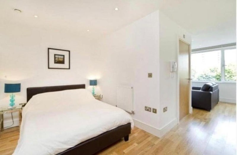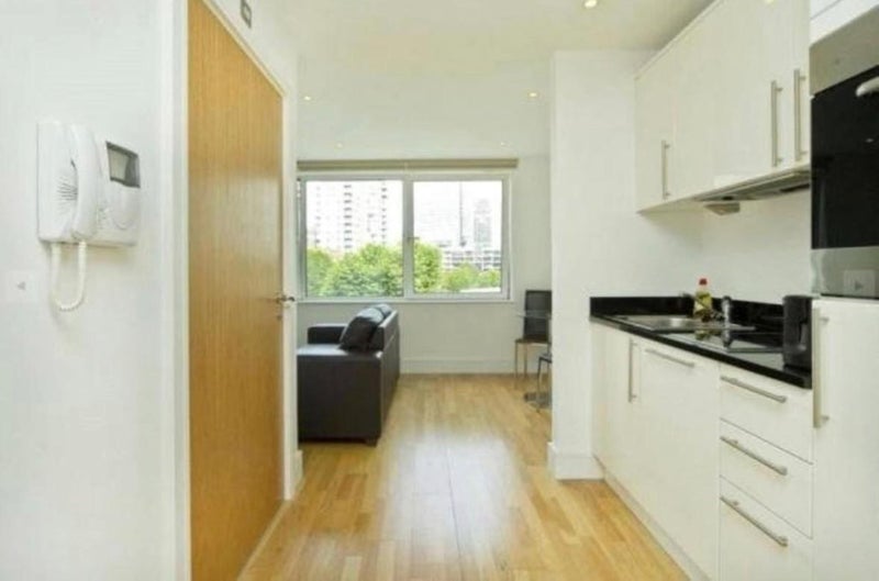 Spacious studio in Indescon Square with nice kitchen and beautiful balcony from living room.