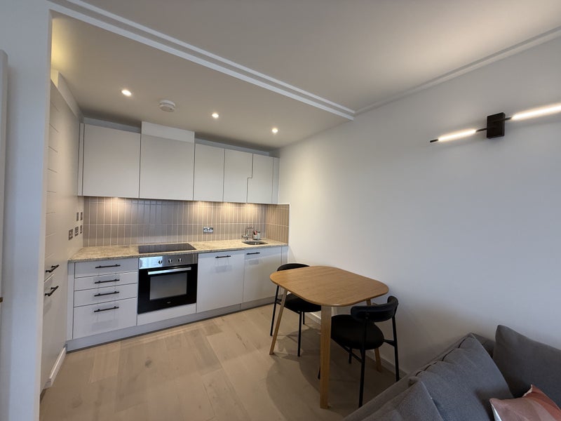 The apartment features a spacious open-plan kitchen, dining, and living area, complete with a comfortable lounging area and access to a private balcony—perfect for enjoying sunrises and sunsets over London.