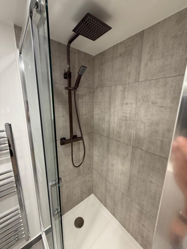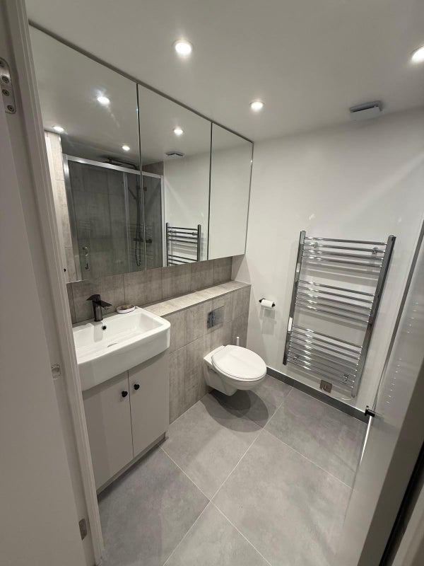 The modern sleek bathroom with underfloor heating is fully fitted with a large walk in shower, large mirror glass cabinets and ample storage.