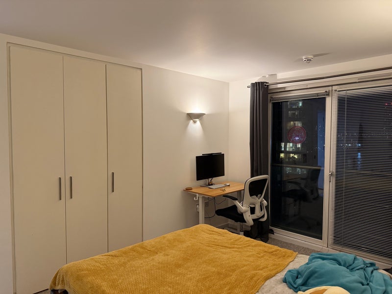 My room is ensuite double bedroom with floor to ceiling window, facing east with views of sunrise, london city airport, thames river and the O2 in North Greenwich.