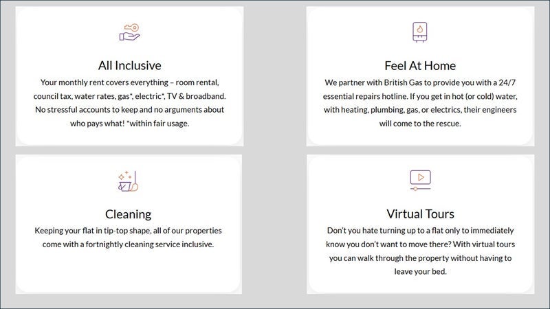 Bills are kept simple with a fixed £100pcm on top of the rent, covering: