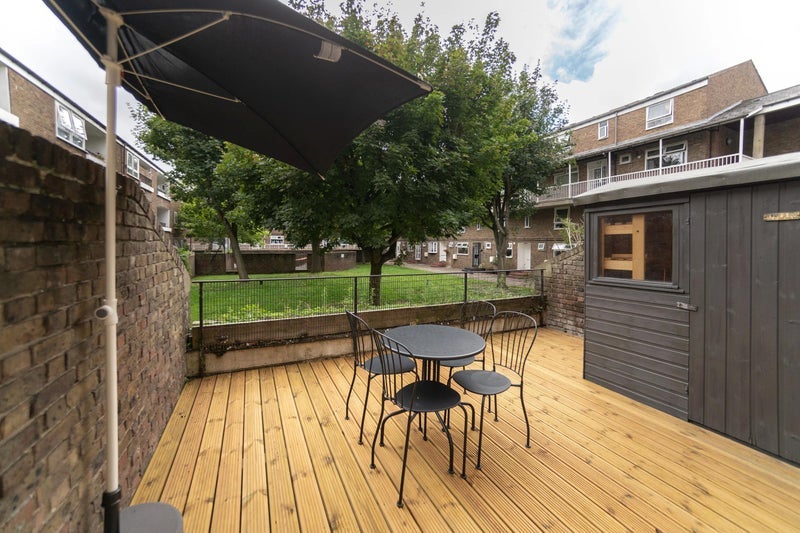 The flat is modern, spacious and fully furnished throughout. The huge open-plan lounge-diner is the standout communal space, complete with all the mod-cons you’d expect and beautiful floor-to-ceiling French doors that open directly onto your own private terrace garden overlooking a quiet, leafy residential square — a rare find this close to the Wharf.