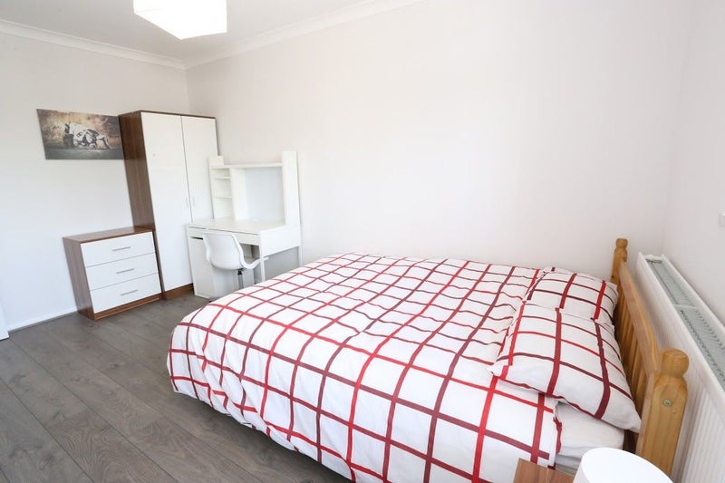 Your generous bedroom comes complete with a double bed, wardrobe, chest of drawers, and a desk with chair — ideal for work, study, or relaxation. The triple-aspect window fills the space with natural light, making it bright and airy with plenty of floor space.