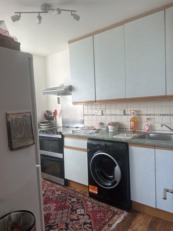 Shared kitchen with full amenities: electric cooker/oven, kettle, microwave, washing machine, fridge-freezer.