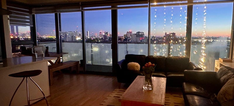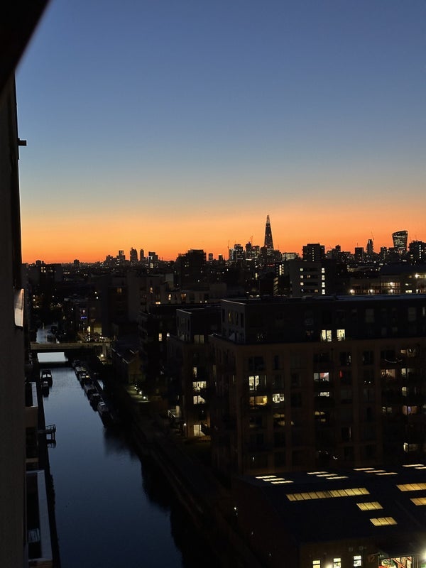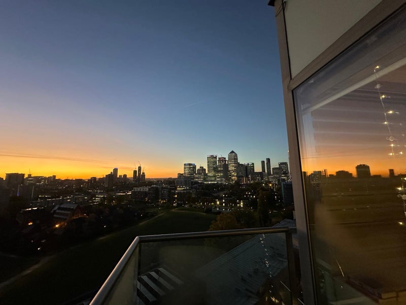 Top floor balcony views of Canary Wharf and City of London, adjacent to Canal and Bartlett Park. View of the Shard from the bedroom.