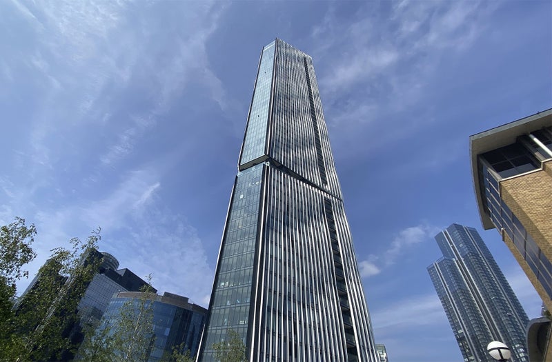 A bright and spacious double room with a stylish ensuite bathroom in a high-rise apartment on the 51st floor of Amory Tower, Canary Wharf. The room features built-in storage and floor-to-ceiling windows, filling the space with natural light and offering uninterrupted views across London and Canary Wharf.