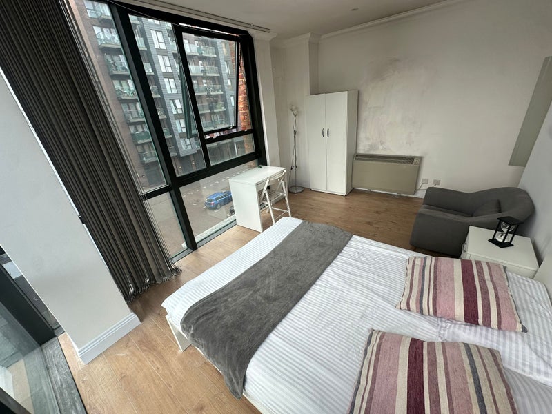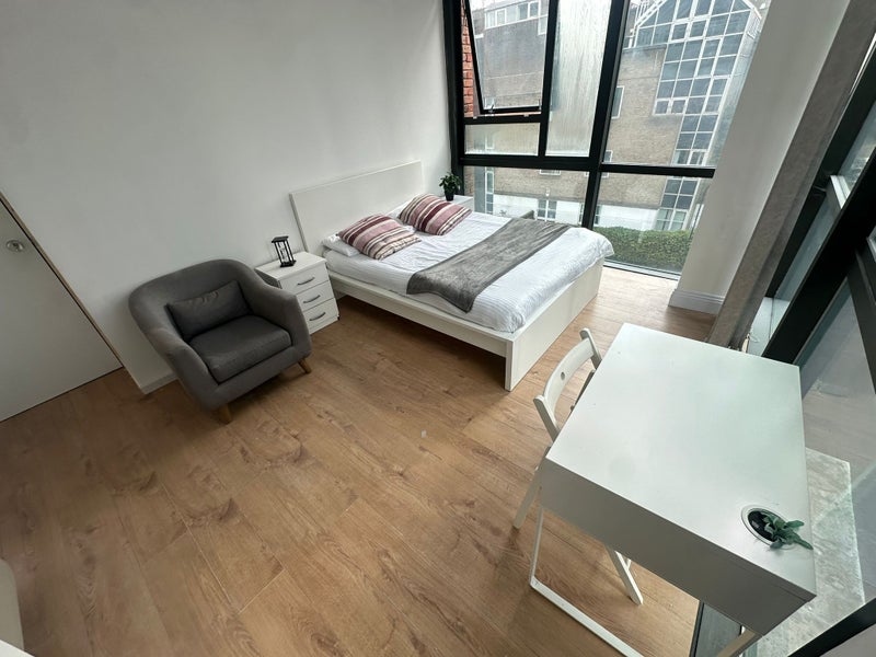 Bright and spacious double room available in a modern flat in E14, featuring floor-to-ceiling corner windows that fill the space with natural light and offer impressive city views.