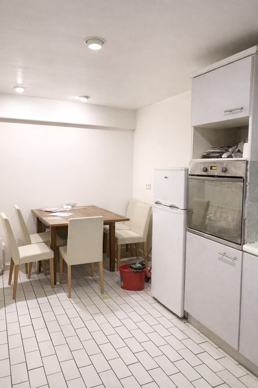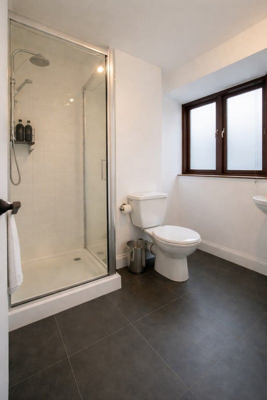 The flat has a shared kitchen and dining area, ideal for relaxed meals and socialising.