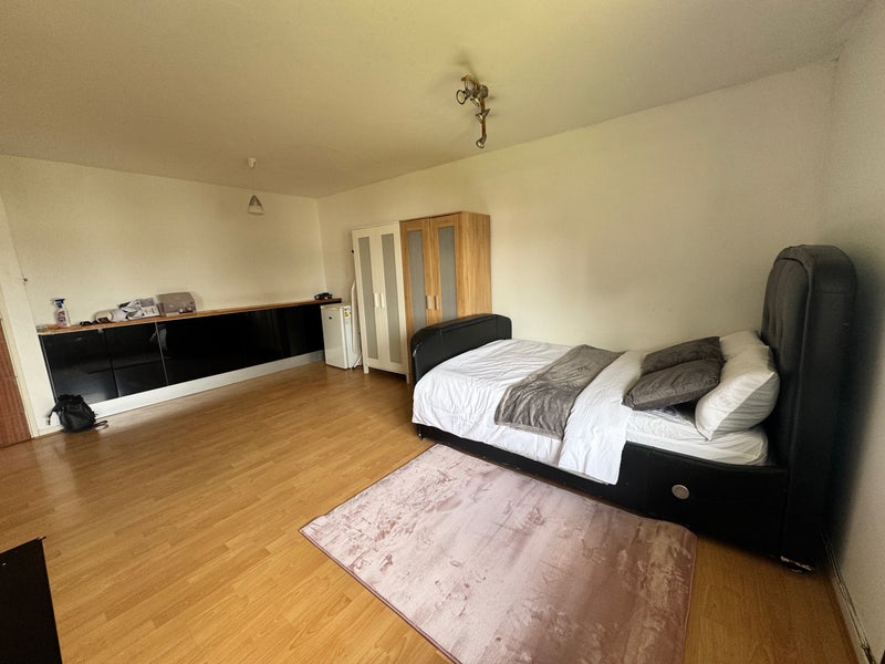 It includes a comfortable double bed, multiple wardrobes providing excellent storage, and a desk with chair—ideal for working from home. The room features wooden flooring throughout and a neutral décor, making it easy to personalise.