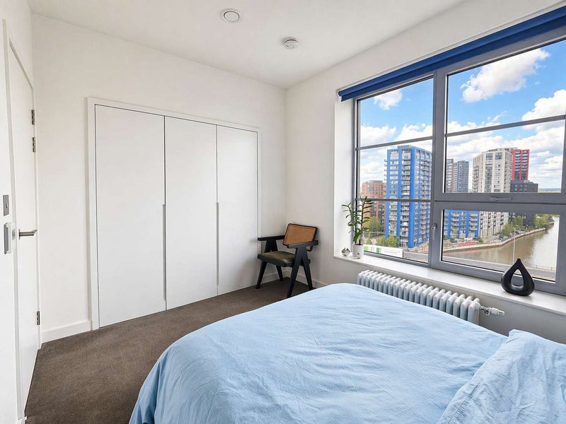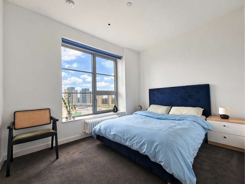 A bright, spacious double room available in a large, high-floor apartment in Douglass Tower, with open views across Canary Wharf and East India Dock Basin.