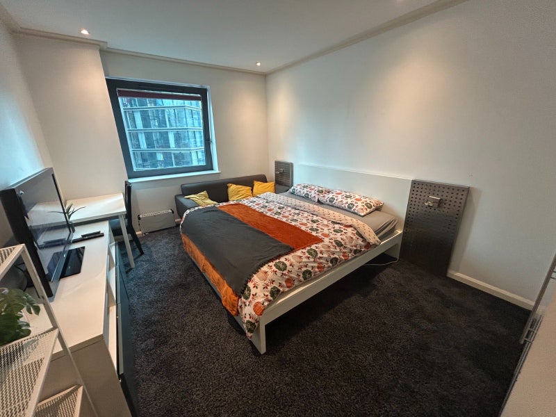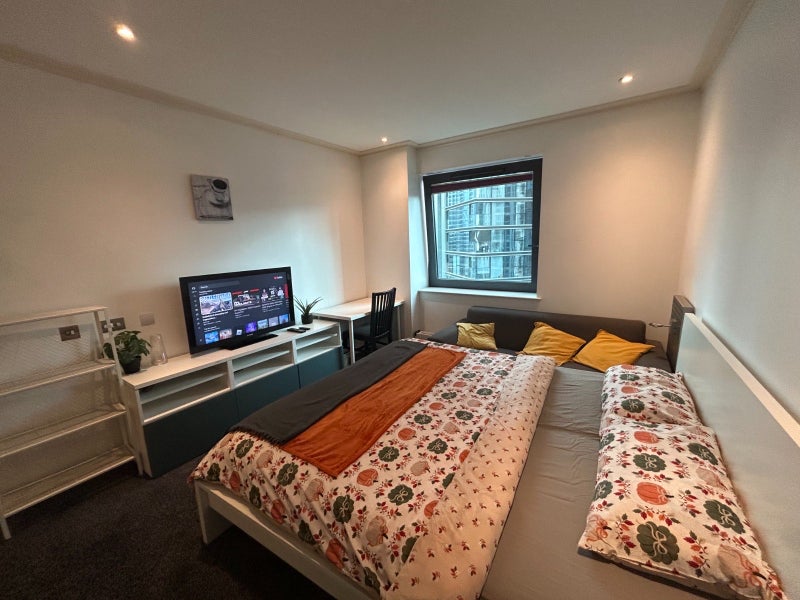 Stunning master bedroom with private en-suite in a fully furnished condo in the heart of Canary Wharf. Beautiful Thames & Canary Wharf views, double bed, large wardrobe, and great natural light.