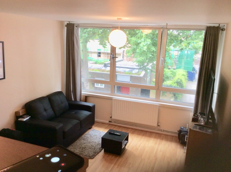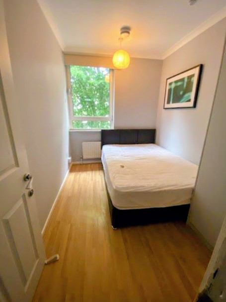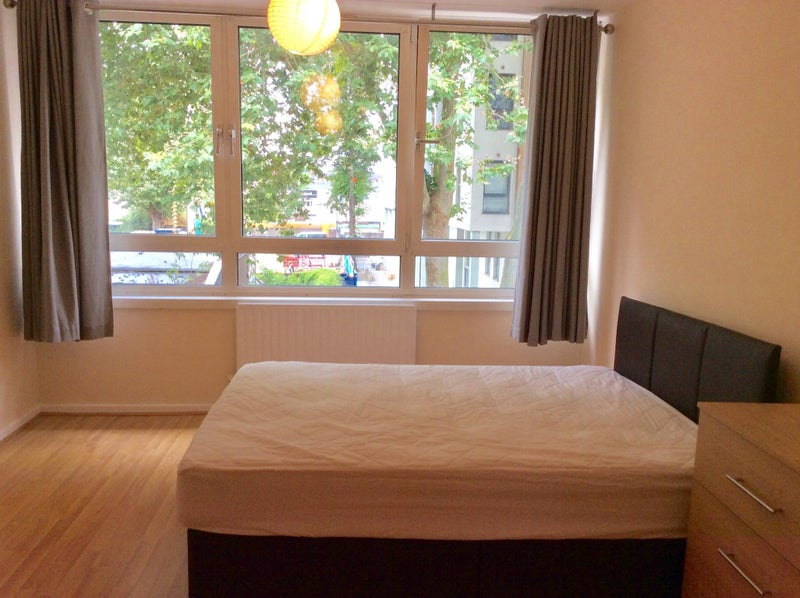 The master bedroom is over 16 meters squared, bright and refurbished. It has a sleeping area with double bed, a home working station, ample storage and a living room space with a sofa.