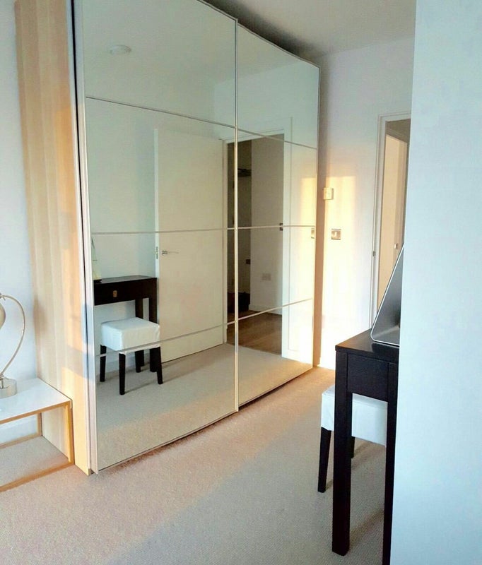 The room features a double bed and large built-in wardrobe with mirrored sliding doors, internal drawers and plenty of hanging and storage space. A neat white desk, large mirror and console table all make this a great space.