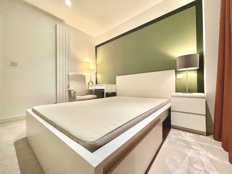-double bed with under drawers, desk & chair, wardrobe, bed side table.
