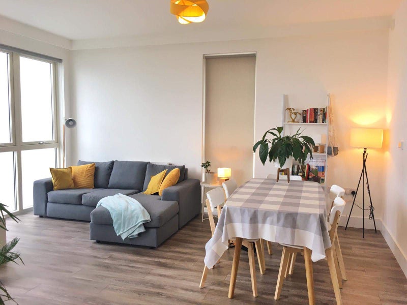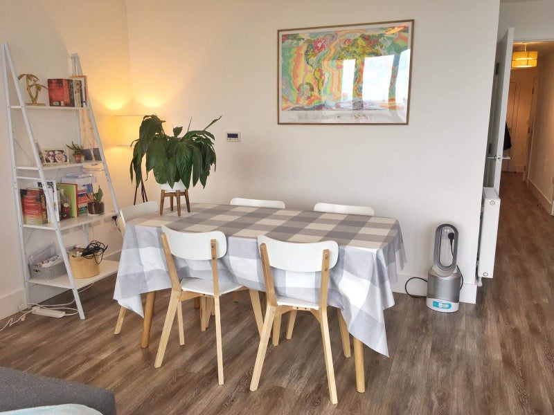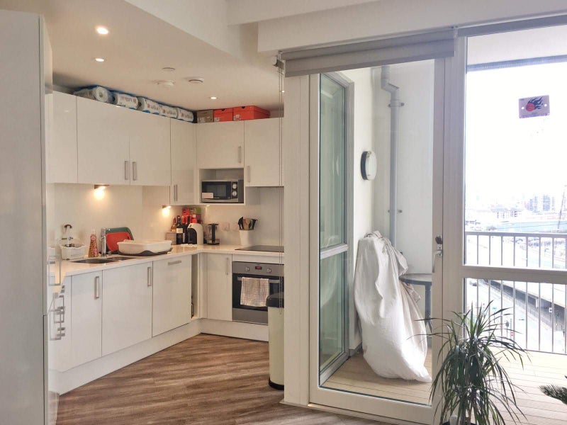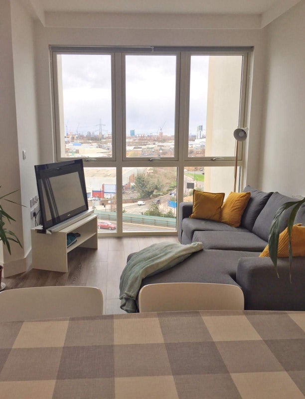 The flat has a large open plan living room and dining area with a galley kitchen, and a large balcony with views across the O2, London skyline and Stratford Olympic park. The aspect faces N-W, meaning we have excellent light in the living area and sunset views.