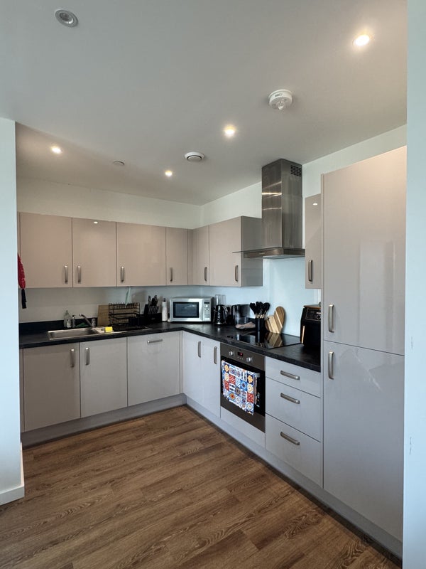 Modern kitchen with a welcoming lounge, and plenty of storage space plus a shared in-unit washer and dryer. The building also features a work-from-home space complete with complimentary high-speed Wi-Fi. Rent includes Broadband and heating costs. Bills are about £130 each per month.