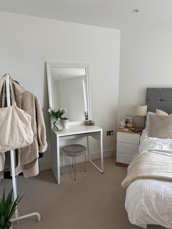 There are 2 bedrooms/2 bathrooms — your room will be a double bedroom with a built in wardrobe, the bedside tables, bigger chest of drawers and full length mirror. I’ll have an en-suite so the main bathroom will be yours!