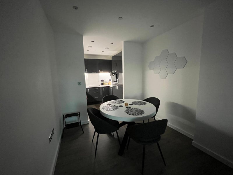 The flat itself is stylish and minimalist, with a spacious living room, large comfortable sofa, dining area, and a fully equipped modern kitchen. The apartment has a clean contemporary design, wooden flooring, and plenty of space, making it feel open and relaxing.