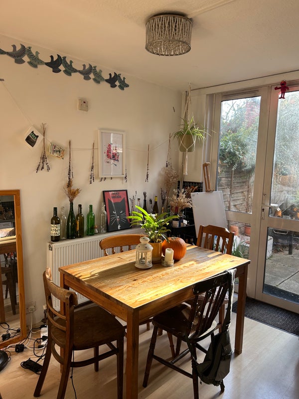 One large room and one small room with a separate large cupboard are now available. Both garden facing double rooms with good storage space. One flatmate is sadly moving back to America and the other is moving in with his best friend to a different area.