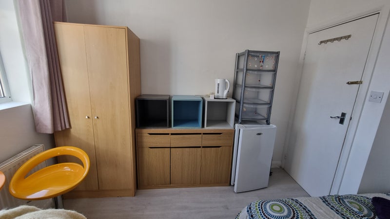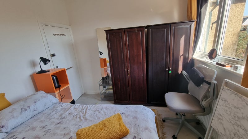 A Double bed with double mattress, Double Wardrobe, double sofa, two bar stools, ruge heavy mirror, small table mirror, two drawers bed side, bookcase, table lamp, 3 cubes storage, huge dry clothes, laundry bag, small fridge_freezer and Kettle,