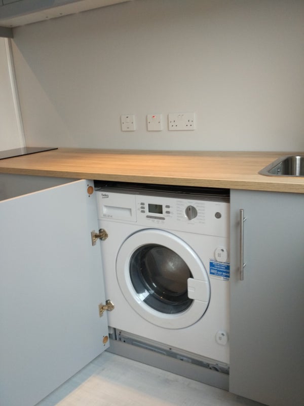 The open-plan kitchen is fully equipped with a fridge/freezer, washing machine, and microwave. The private bathroom is located on the same floor for added convenience. Large windows throughout the flat fill the space with natural light, making it a warm and inviting environment.