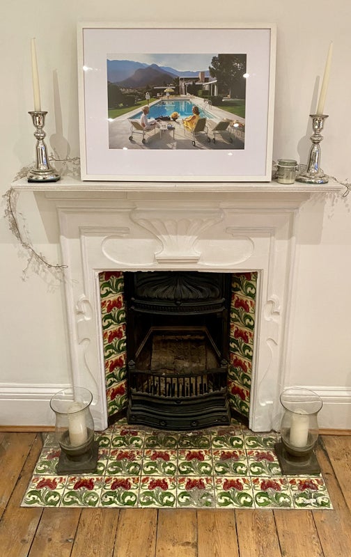 The bedroom is light and bright, with wooden floors and original fireplace (not in use).