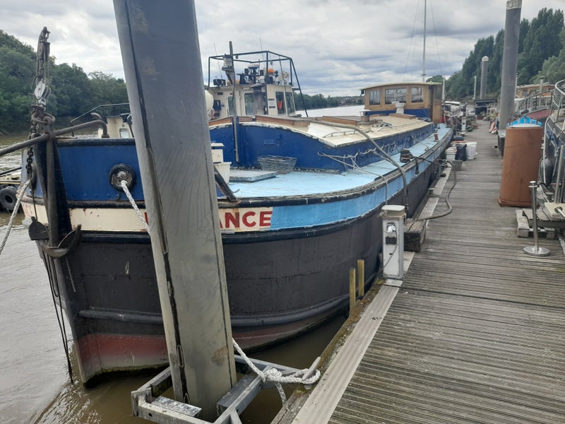 The boat remains fully in the water at all times and is on the outer side of Chiswick Pier. Sometimes workboats will come and moor next to the boat - at the moment there is one that will be here for a month or so.